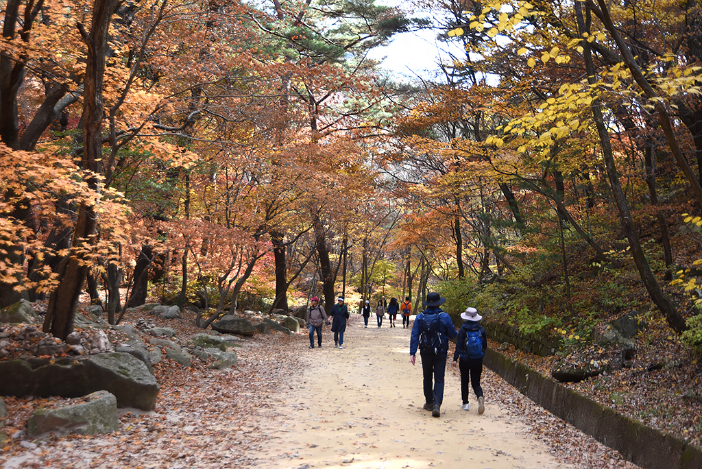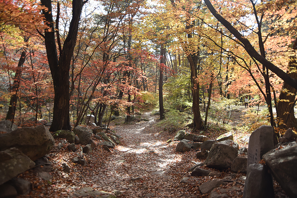 숲속 길이다. 소나무 숲 사이 홍엽도 볼만하다. 사면 돌고 돌아 골짜기에 내려서고 바로 몇 미터 위가 혜국사인