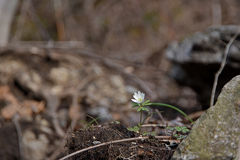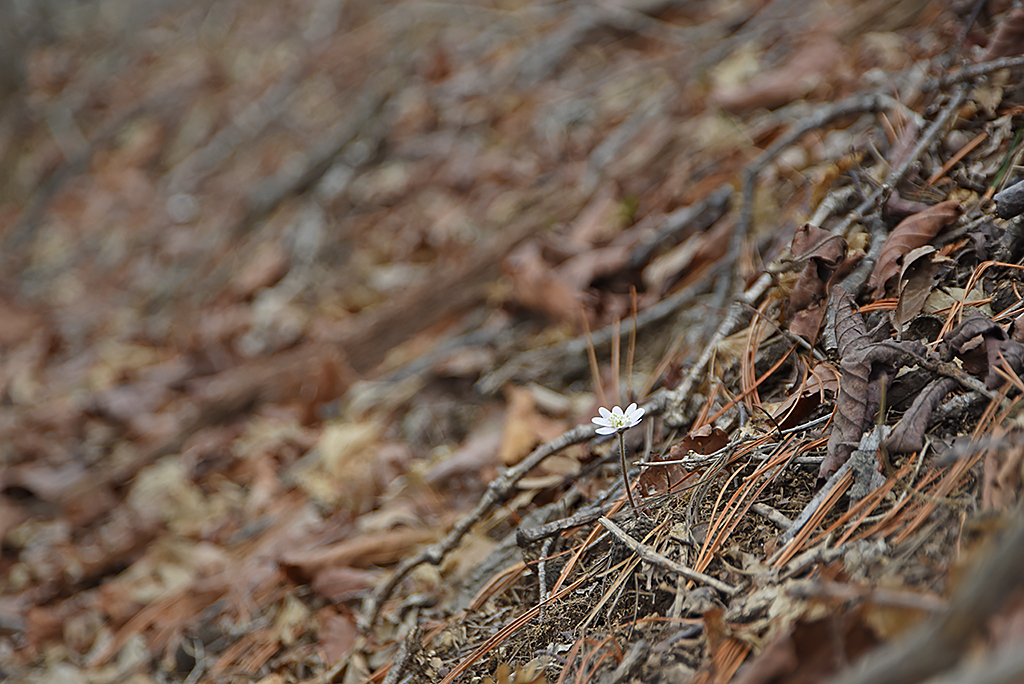 하게 쌓인 사면 저쪽에 꽃의 형상이 보인다. 다가간다. 노루귀다. 안준철 시인이 말한 「겨우 핀 꽃」이다.