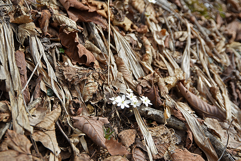 해묵은 낙엽더미에서 겨우 핀 꽃들에게