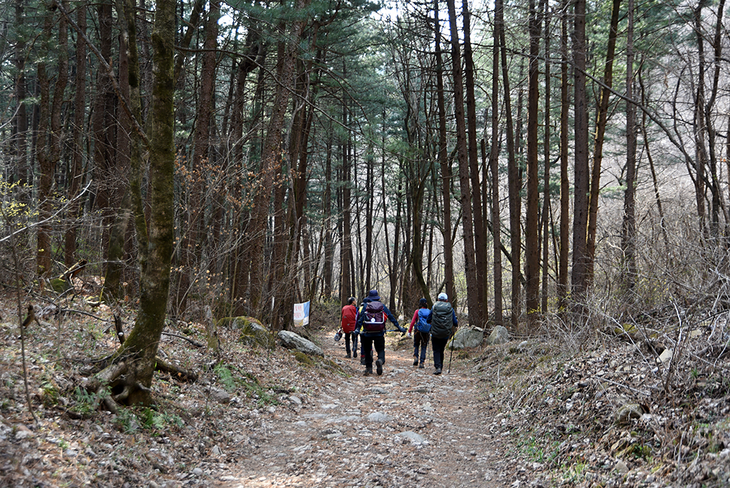 팔을 걷어붙여도 덥다. 잣나무 숲 지나면 참나무 숲이 이어진다. 겨우내 눈 더미에 짓눌렸던 낙엽이 부스스 일어난