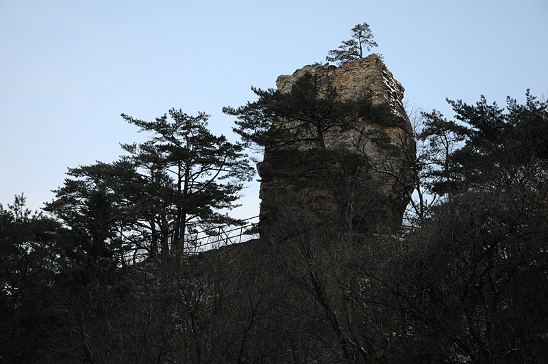 석주가 30m가량 되는 절벽 위에 우뚝 서 있다. 김일성이만 탓할까. 암벽에 새긴 수 명의 이
