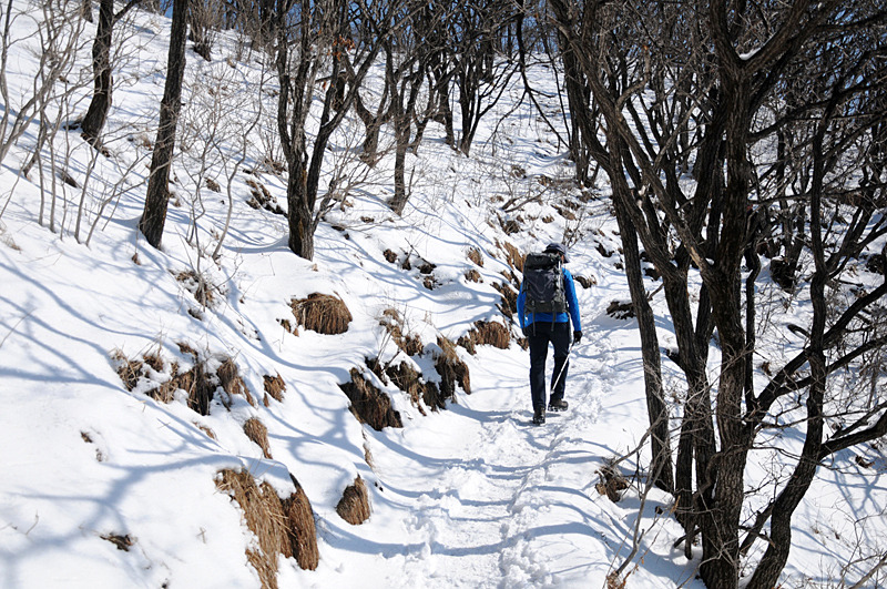 입석사 지나고도 주등로 따라 오른다. 산죽숲 지나 가파른 너덜길이 이어진다. 눈길을 간다.