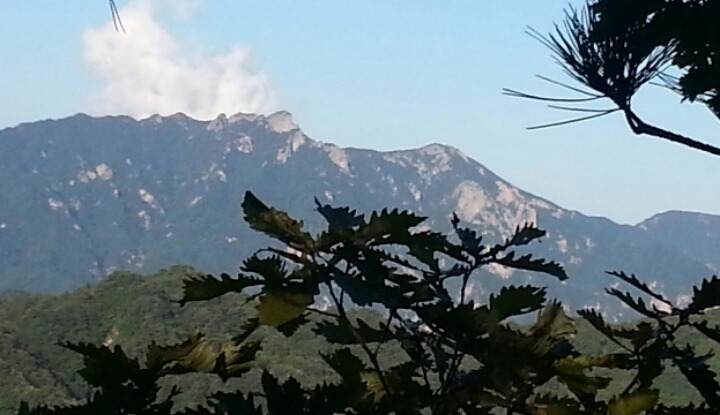 이 힘겨운 광경을 쳐다 보다가 아무래도 난 왠지 못 오를 것 같고 총대장 님이 오른 암릉이 더 쉽지 않을까 하고 쳐다보니 악수 님이 설익은 밥먹고 거기 보지 말고 이쪽으로 오르란다.그래서 다시 되돌아 와서 돌뿌리와 나무가지 의지하여 오르는데도 만만치가 않다.대포 님은 이럴때 긴다리를 써보지 언제 쓰겠냐며 내가 잘 오르도록 발로 받쳐준다.그 암릉을 오르자 그 위에 있는 편편한 곳에서 모두들 쉬고들 있다. 한참 후에 산소리 님과 도자 님이 오른쪽으로 우리가 쉬고 있는 곳으로 올라온다.아마도 또 다르게 오르는 길이 있었나 보다.