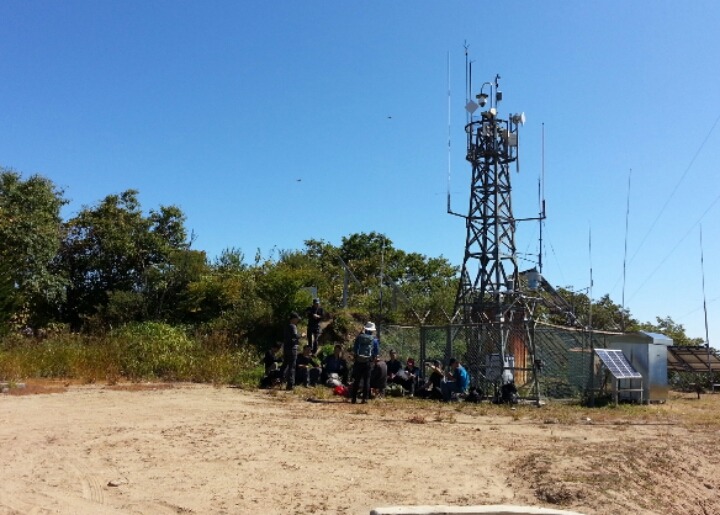 모두들 산악기상관측장비 옆에서 쉬고 있다.