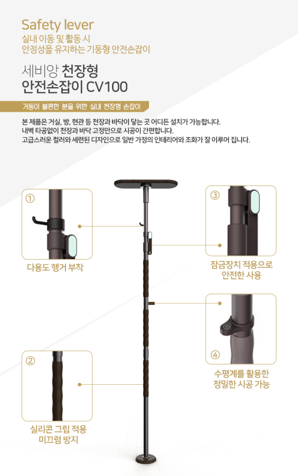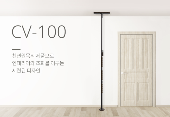 안전손잡이 CV100은 거실, 방, 현관 등 천장과 바닥이 닿는 곳 어디든 설치가 가능합니다. 내벽 타공없이 천장과 바닥 고정만으로 시공이 간편합니다. 고급스러운 컬러와 세련된 디자인, 100% 천연원목 지지대와 알루미늄 바로 만들어졌습니다.