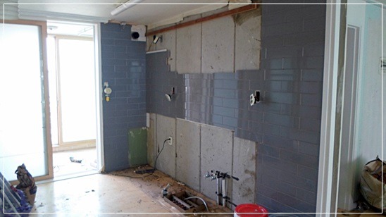 철거 후 씽크대타일을 붙였습니다.
