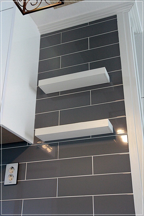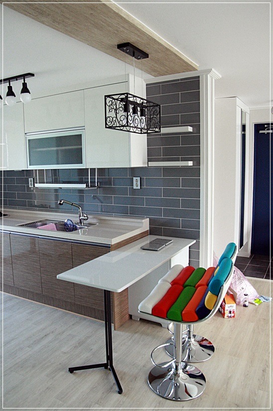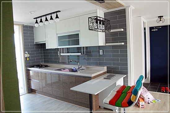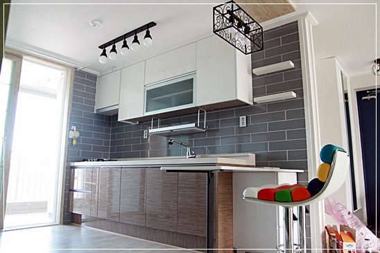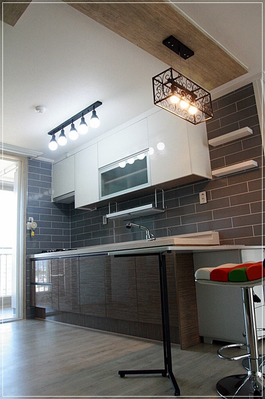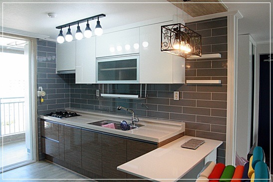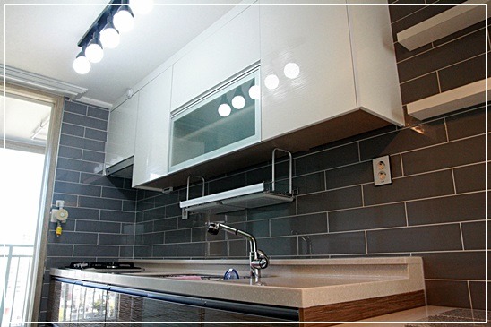 회색인 타일을 씀으로 씽크대 상부장이 눈에 들어옵니다.