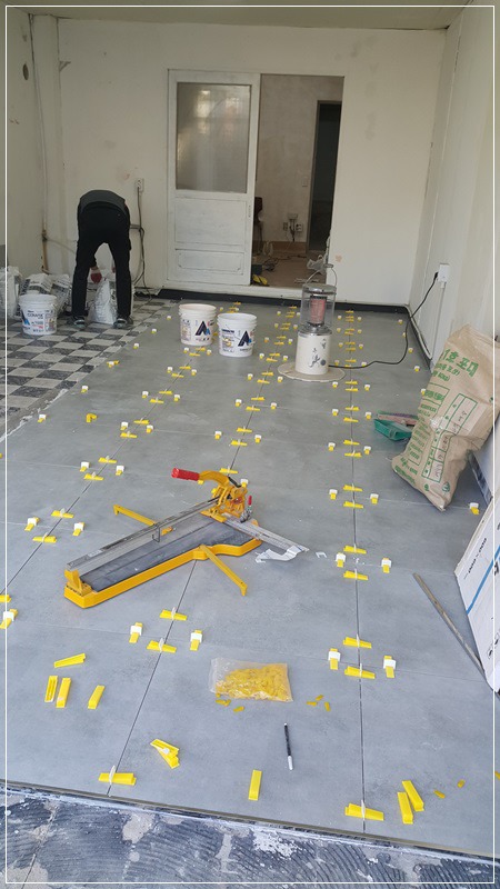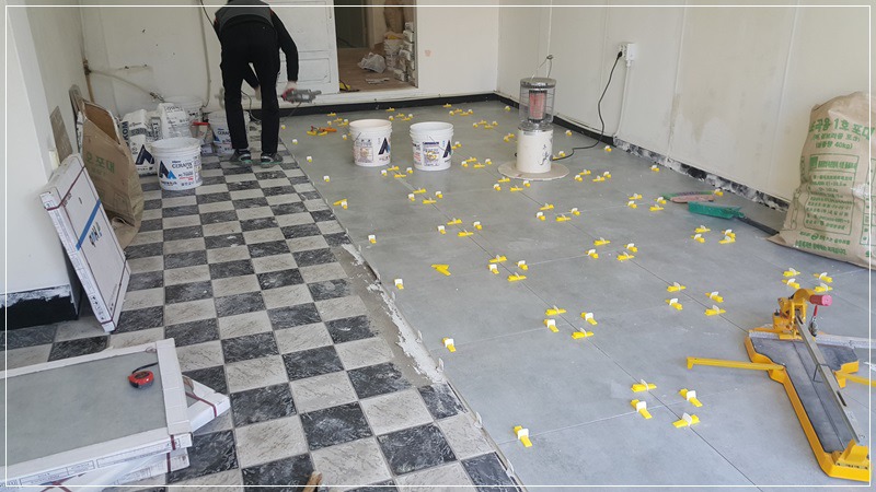 바닥 타일은 2인 1조로 까는 것이 효율적입니다.