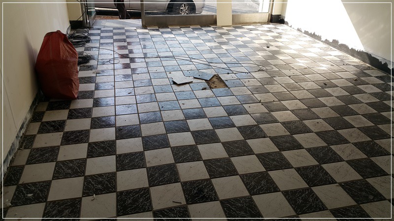 가운데 부분에 타일이 깨져있고, 타일 배부름 현상이 있습니다.