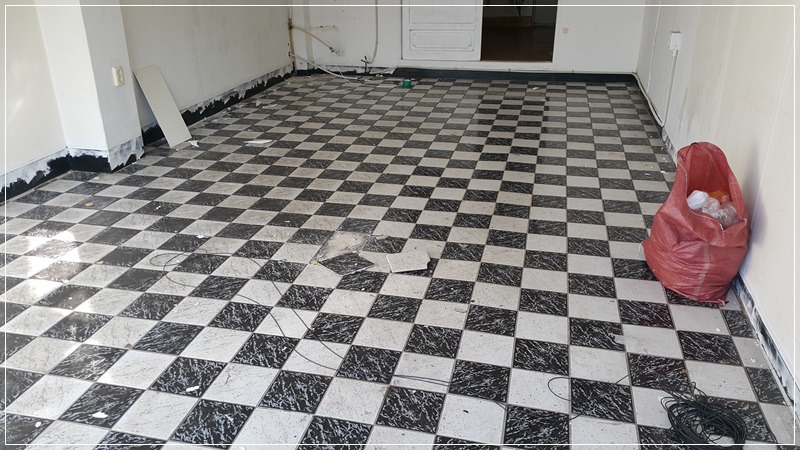 출입구 쪽은 타일을 걷어 내고 얇은 헥타곤 타일을 깔 겁니다.