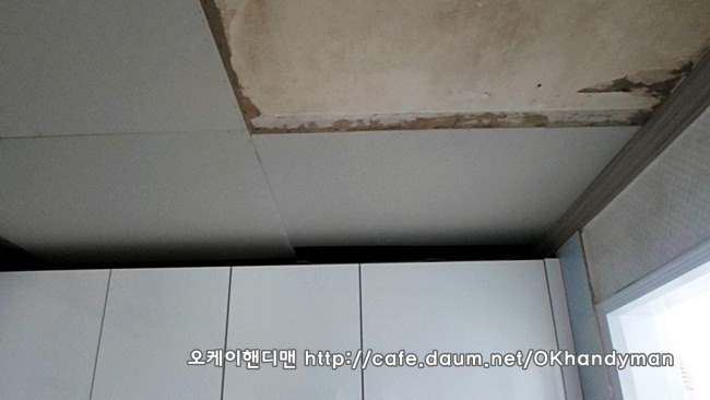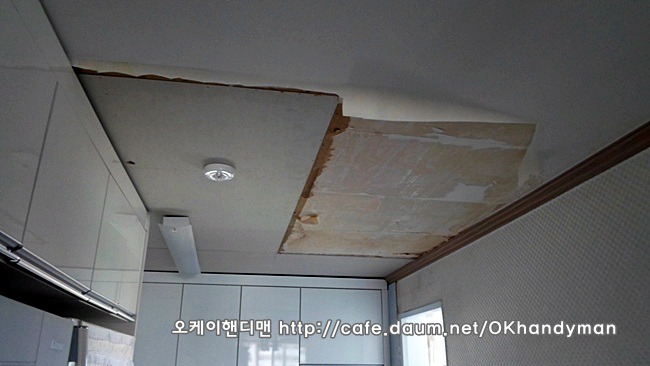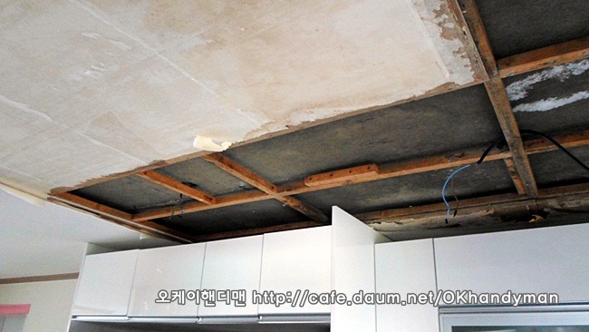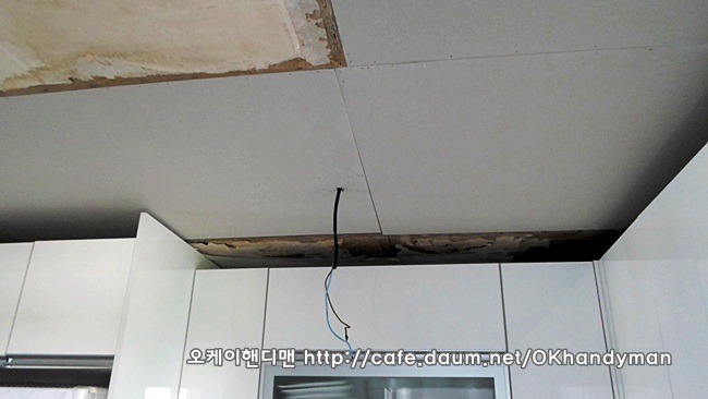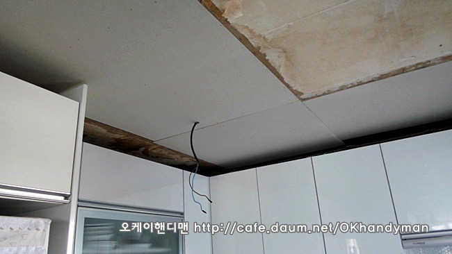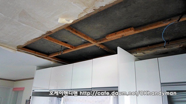 씽크대 상부장을 뜯어 내는 것이 아니라 상부몰딩만 철거한 다음 천정공사를 하면 됩니다.