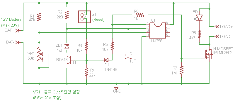 보다 낮은 전위가 됩니다. 그래서 부하가 꺼져서 배터리 전압이 올라가더라도 출력은 계속 OFF 상태를 유지하여