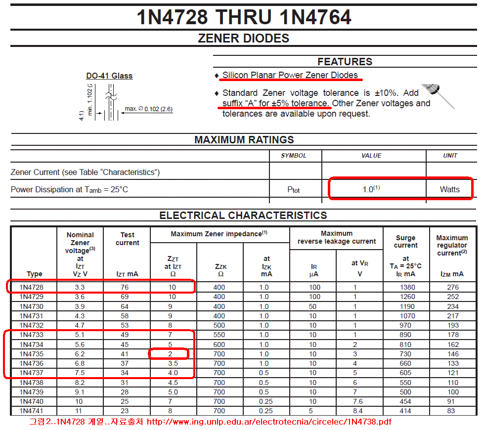 1N4728-4764에서 Zzt 가 가장 작은 것은 1N4735 로 2옴이고 6.2V 제너입니다.