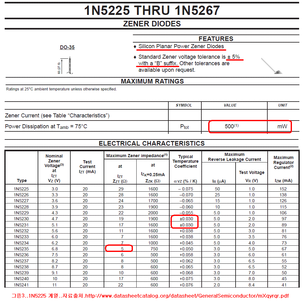 1N5225-5267 는 정격전류가 작으므로 작은 전류에서 정격전압(?) 이 나오지만