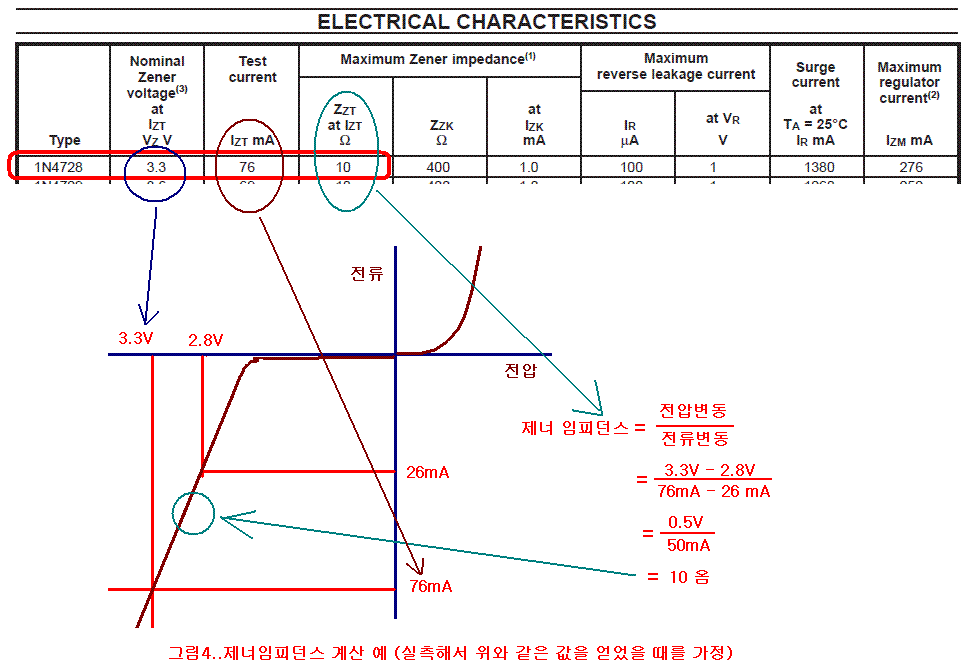 제너임피던스의 실제의 계산 예 를 들면 1N4728 의 경우 (실제로는 오차가 있지만)