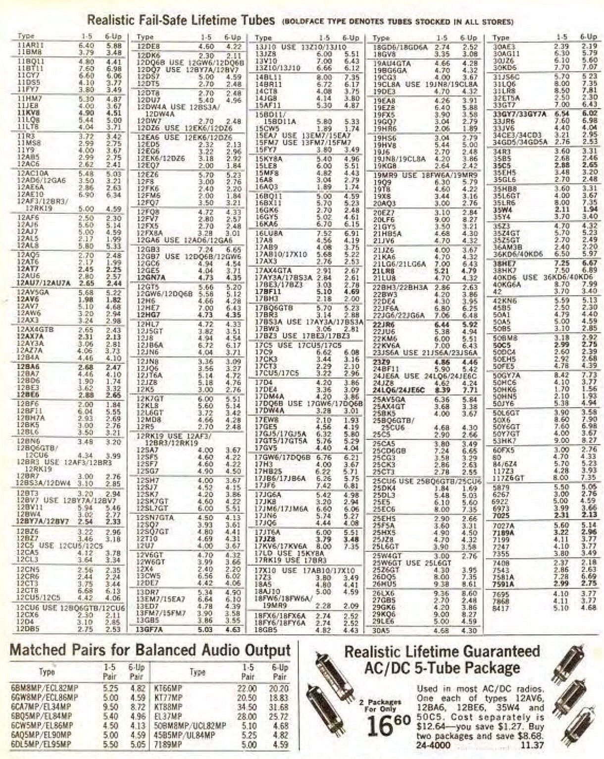 [1976] Radio Shack Tube 가격 작성자별빛바라기|작성시간21.01.10|조회수187 목록 댓글 2 글자크기 작게가 글자크기 크게가 1976년 Radio Shack Catalog에 게재된 진공관 판매 가격 입니다. 다음검색 현재 게시글 추가 기능 열기 북마크 공유하기 신고 센터로 신고 댓글 댓글 2 댓글쓰기 답글쓰기 댓글 리스트 작성자송진내음 | 작성시간 21.01.10 매번 느끼지만 딴세상 이야기 같습니다.ㅎ이 가격으로 2A3 한조 구입하고 싶어요. 작성자운영지기 | 작성시간 21.01.10 1976년 12AX7 2달러대로 국내판매가 보다 저렴 했었네요당시 5Y3 중고관 끼워주고수리비 5백원 받을때니까요.. 댓글 전체보기