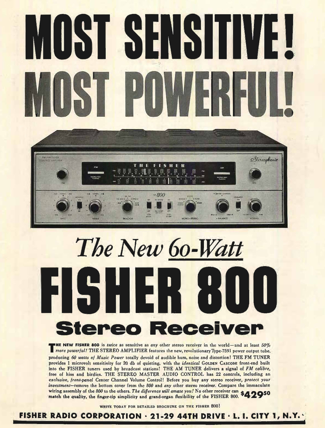 Fisher 800 리시버에는 22구의 튜브를 사용하여 AM / FM 튜브 기술에서 최고중 일부를 포함하고 있으며 매혹적인 라디오 역사를 상징합니다. 진정한 멀티 플렉스 FM 스테레오 (오늘날 사용중인 시스템)를 지원하는 최초의 리시버 중 하나입니다. 800이후에 800B,C,T등 개량형이 출시 되어 800 Receiver의 명성을 떨친 유명한 리시버입니다.