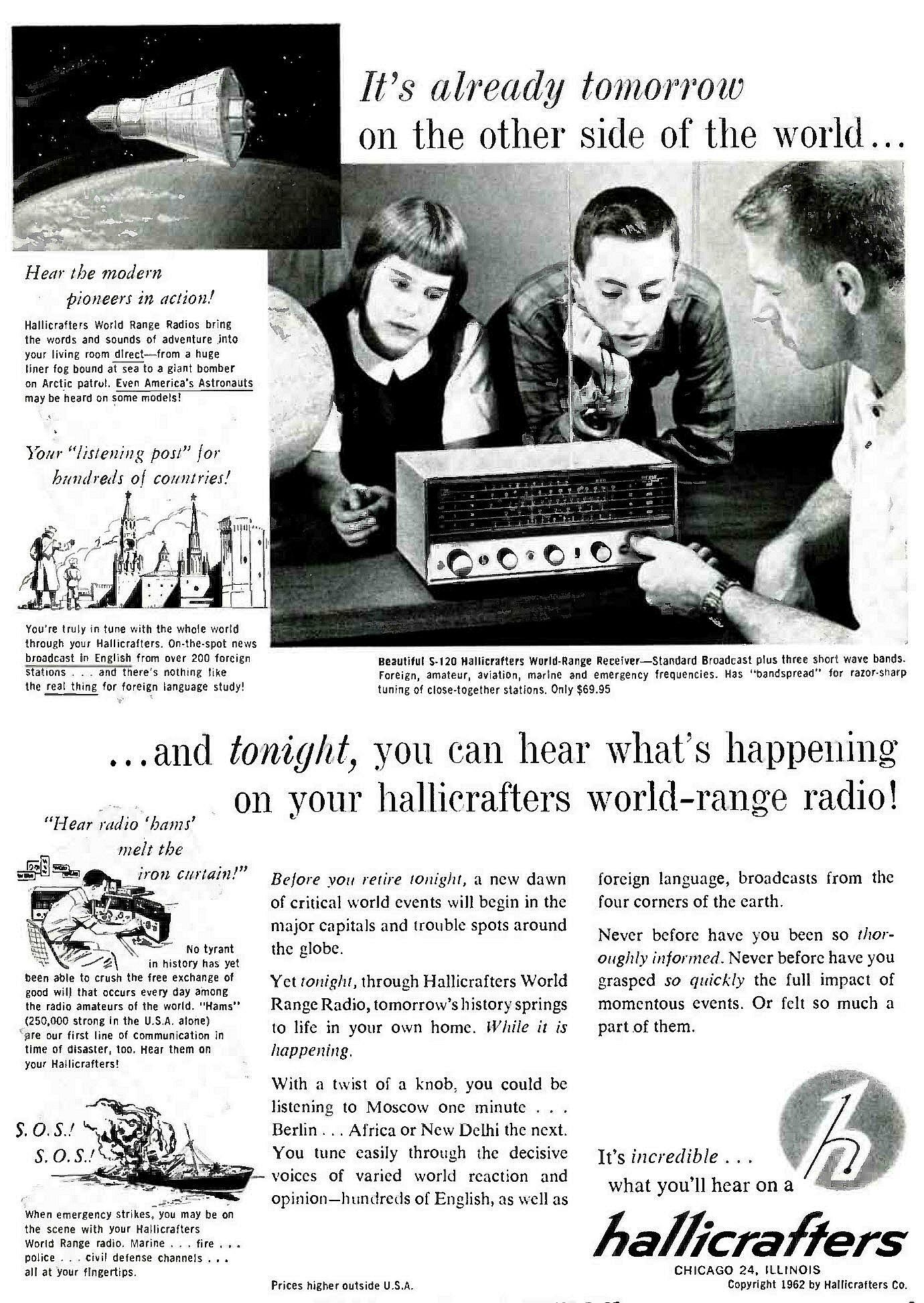 [1962] Hallicrafters S-120 Receiver 작성자별빛바라기|작성시간21.04.23|조회수135 목록 댓글 2 글자크기 작게가 글자크기 크게가 Hallicrafters사에서 S-38 Series이후 가장 많이 판매되었던 Best Seller 기기인 S-120 Receiver 광고입니다. Electronics world 1962년 12월호에서 다음검색 현재 게시글 추가 기능 열기 북마크 공유하기 신고 센터로 신고 댓글 댓글 2 댓글쓰기 답글쓰기 댓글 리스트 작성자운영지기 | 작성시간 21.04.23 S-38에 비해 S-120다이얼창이 시원하게 탁트였네요베스트 셀러 모델로 부족함 없었군요.. 작성자운영지기 | 작성시간 21.04.24 본문 이야기중 S-38 모델 이미지모르는분 위해 첨부 합니다.. 이미지 확대 댓글 전체보기