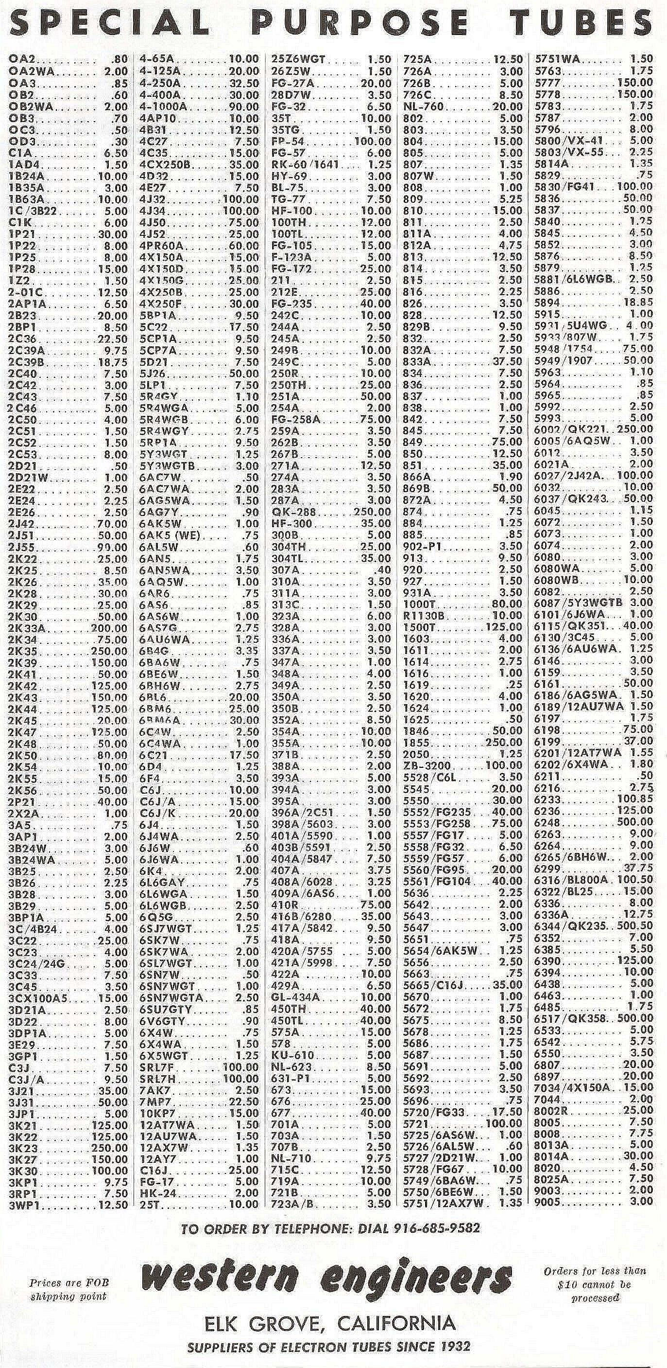 1962년 특수목적(ex:송신관)관 가격표입니다.