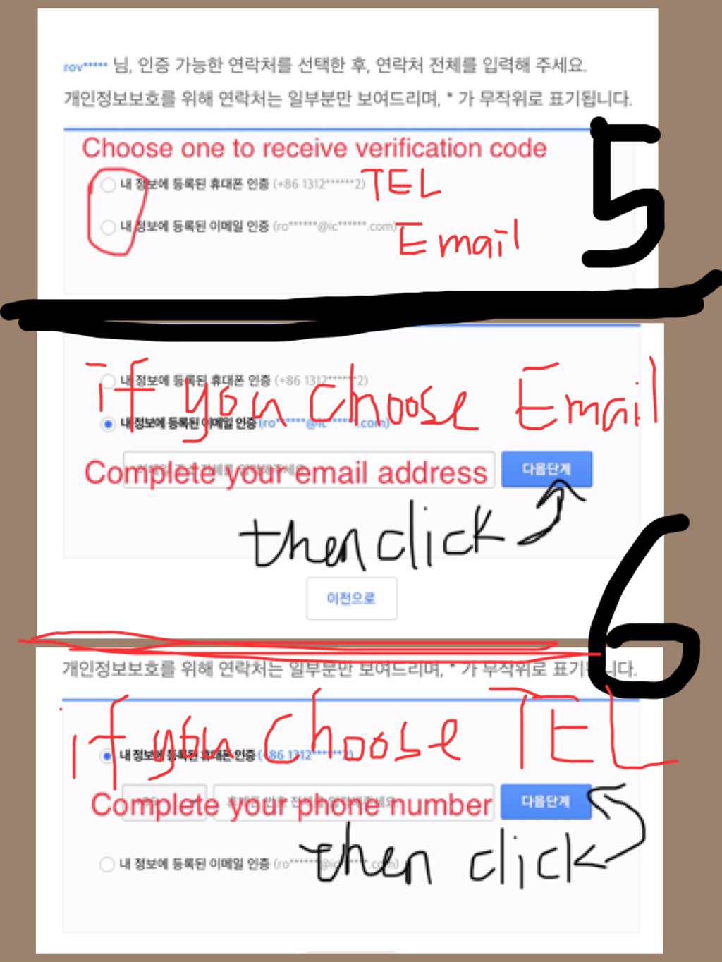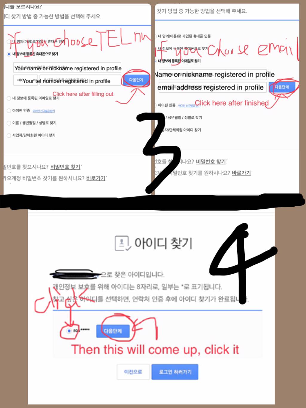 - 회원정보에 등록된 연락처(휴대폰/이메일): (your tel number you registered in your profile/the Email address you registered in your profile)