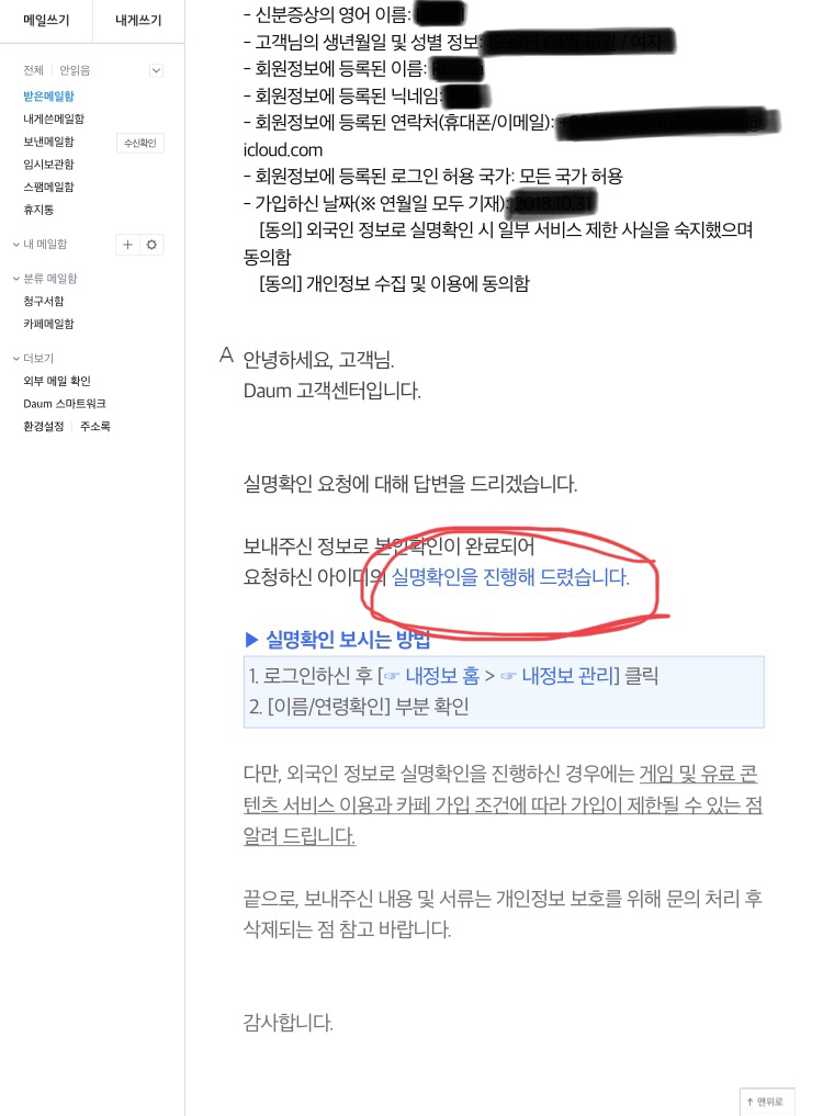3. After sending the Email, just wait for about one day. When you receive a reply titled “Daum 고객센터에서 답변드립니다”(not the one you receive in about 10min after you send your email, that one is to inform you they’ve received your mail), if you see content in blue font like the one below