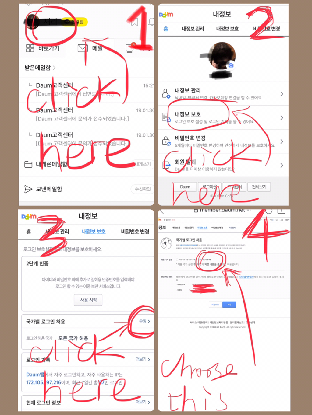 - 회원정보에 등록된 로그인 허용 국가: (fill “모든 국가 허용”,you should set it in advance,I will teach you how to set below. If you forgot the date, check the way to find it below )