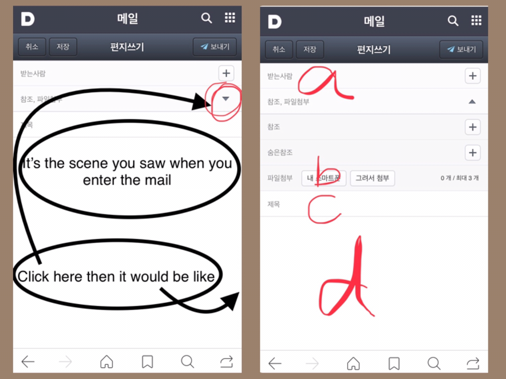 1. Download a Daum app(not the same with DaumCafe app) and then log in(use the id the same with DaumCafe). Then click on the mail(메일), then click “받은메일함” just below the mail. Then click on the pencil pattern in the upper right corner to write your email.