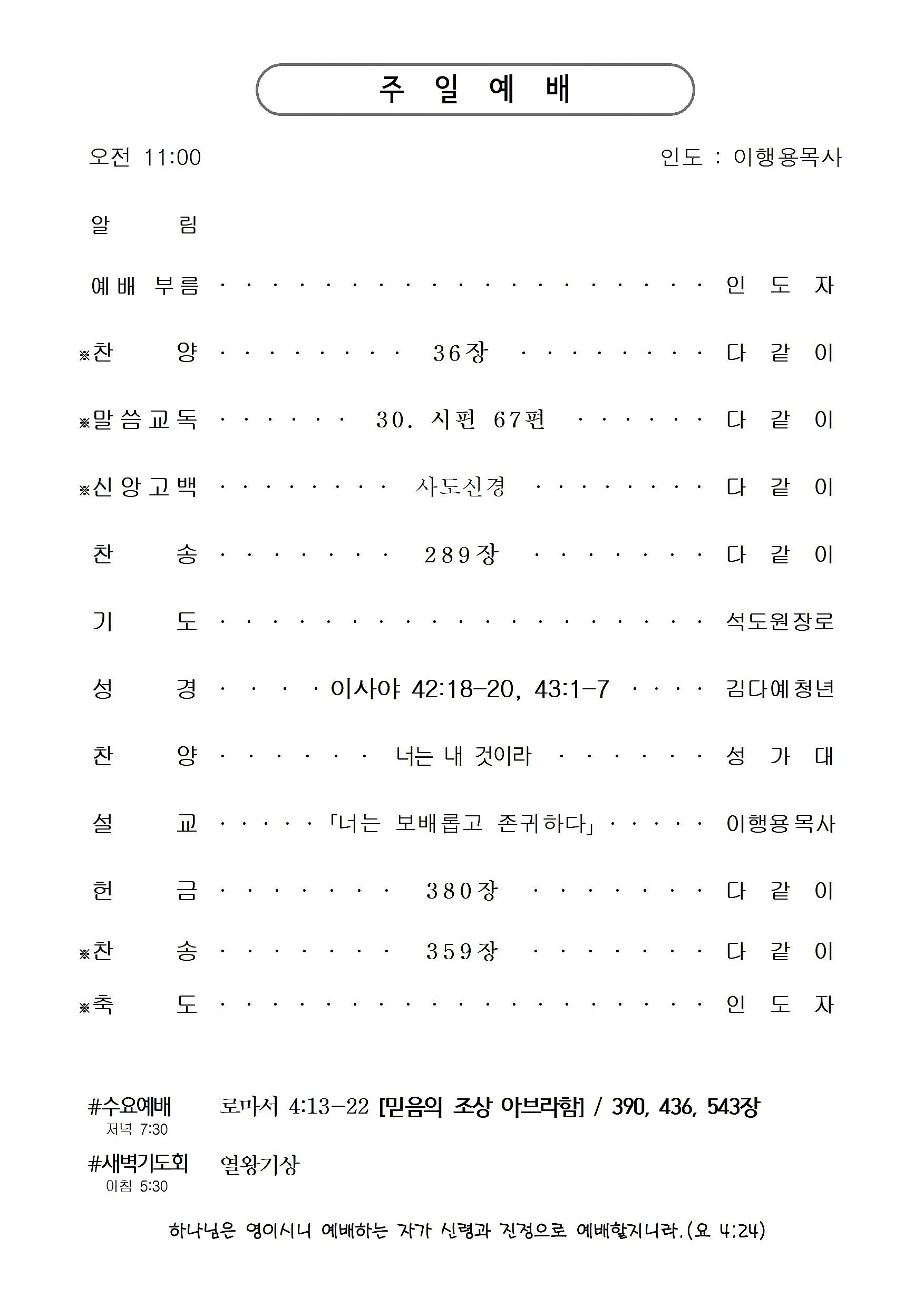 43:1 야곱아 너를 창조하신 여호와께서 지금 말씀하시느니라 이스라엘아 너를 지으신 이가 말씀하시느니라 너는 두려워하지 말라 내가 너를 구속하였고 내가 너를 지명하여 불렀나니 너는 내 것이라 2 네가 물 가운데로 지날 때에 내가 너와 함께 할 것이라 강을 건널 때에 물이 너를 침몰하지 못할 것이며 네가 불 가운데로 지날 때에 타지도 아니할 것이요 불꽃이 너를 사르지도 못하리니 3 대저 나는 여호와 네 하나님이요 이스라엘의 거룩한 이요 네 구원자임이라 내가 애굽을 너의 속량물로, 구스와 스바를 너를 대신하여 주었노라 4 네가 내 눈에 보배롭고 존귀하며 내가 너를 사랑하였은즉 내가 네 대신 사람들을 내어 주며 백성들이 네 생명을 대신하리니 5 두려워하지 말라 내가 너와 함께 하여 네 자손을 동쪽에서부터 오게 하며 서쪽에서부터 너를 모을 것이며 6 내가 북쪽에게 이르기를 내놓으라 남쪽에게 이르기를 가두어 두지 말라 내 아들들을 먼 곳에서 이끌며 내 딸들을 땅 끝에서 오게 하며 7 내 이름으로 불려지는 모든 자 곧 내가 내 영광을 위하여 창조한 자를 오게 하라 그를 내가 지었고 그를 내가 만들었느니라