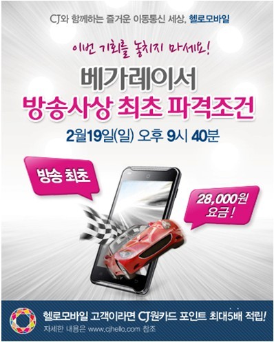CJ헬로비전에서 시작하는 이동통신사업 (MVNO) 사업에 팬택의 전용 스마트폰베가레이서를 공급하기로