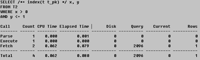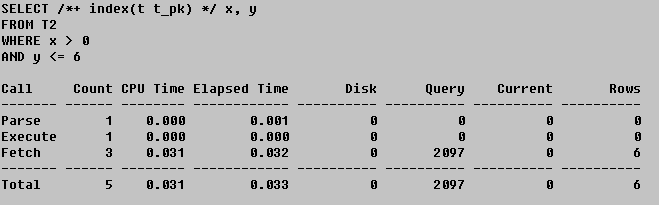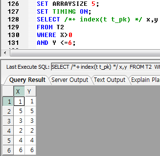 - SQL*Plus에서 테스트 해 보면 'x>0 and y<=6' 조건으로 쿼리를 수행했을 때, 첫 번째 Fetch Call에서 5개를 빠르게 전송 받기 때문에 대기 없이 곧바로 출력이 이루어 진다. 그렇다면 'x>0 and y<=5' 조건을 사용했을 때 Array 버퍼가 첫 번째 Fetch Call에서 금방 채워지므로 쿼리를 시작하자마자 5건이 바로 출력되어야 하는데 'x>0 and y<=1' 조건을 사용했을 때처럼 한참 후에야 5건을 출력하고 수행을 마친다.
