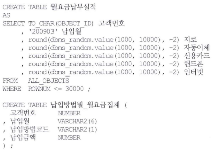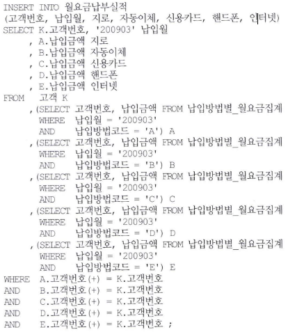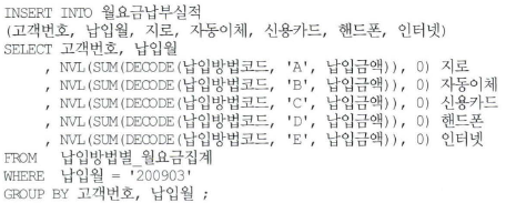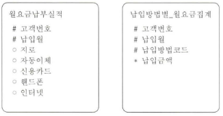 -> '월요금납부실적' 테이블은 고객별 납입방법별 납입요금을 컬럼 값으로 입력하고, '납입방법별_월요금집계' 테이블은 납입요금을