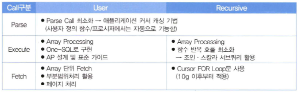 <데이터베이스 Call의 종류와 튜닝 원리를 요약한 표>