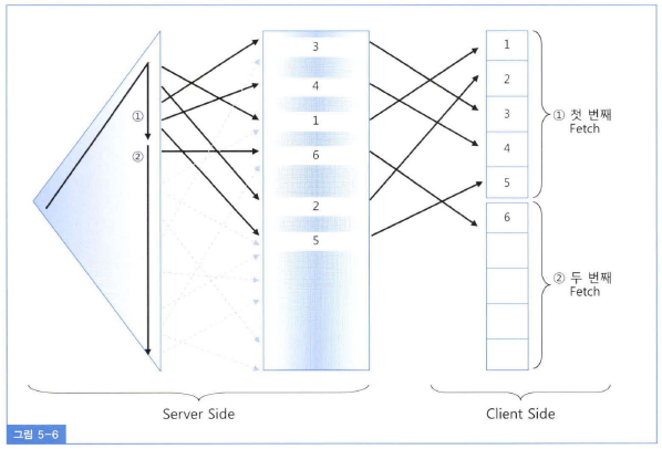 -> 첫 번째 Fetch에서는 1건만 가져오고, 두 번째 Fetch에서 5건을 가져와 클라이언트 측 Array 버퍼를 채운다. 5개가 채워졌으므로
