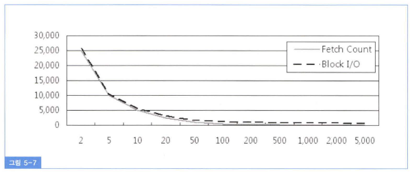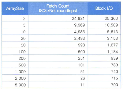 -> ArraySize를 키운다고 해서 같은 비율로 Fetch Count와 Block I/O가 줄지는 않는다. 무작정 크게 설정한다고 좋은 것만은