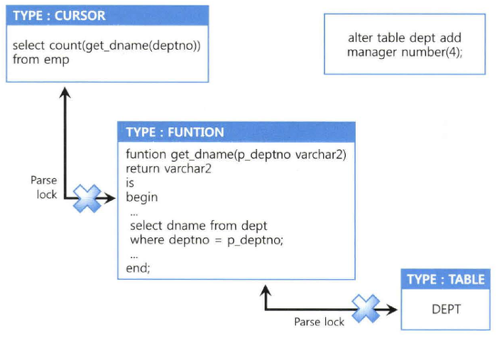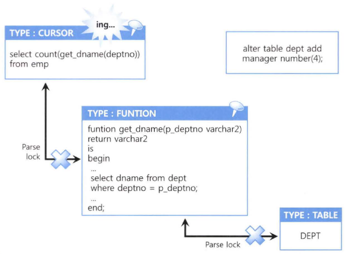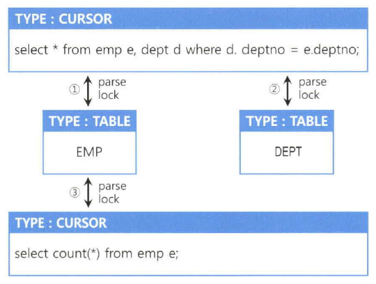 - 예를 들어, alter table EMP 문장이 수행되면 위 그림의 ① 번과 ③ 번 Parse Lock을 해제함으로써 이 오브젝트를 참조하던 두