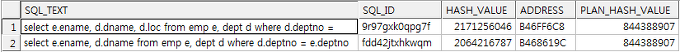 ※ SQL_ID, HASH_VALUE, ADDRESS 는 다르더라도 PLAN_HASH_VALUE 가 같으므로, 두 개의 SQL 커서가 하나의 실행계획