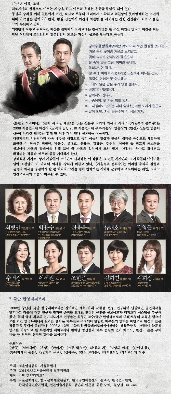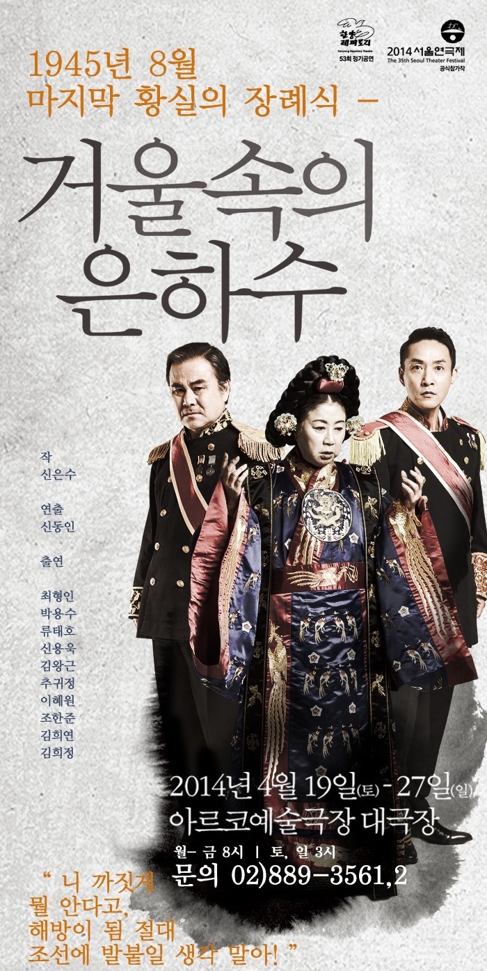 2014 서울연극제 공식참가작 한양레퍼토리(서일대학교 신동인 교수님) '거울 속의 은하수' 작성자이현승|작성시간14.04.23|조회수156 목록 댓글 1 글자크기 작게가 글자크기 크게가 다음검색 현재 게시글 추가 기능 열기 북마크 공유하기 신고 센터로 신고 댓글 댓글 1 댓글쓰기 답글쓰기 댓글 리스트 작성자이현승 작성자 본인 여부 작성자 | 작성시간 14.04.23 청소년 할인 30%(만 24세 이하) 있습니다. 단체관람 문의는 02)889-3561 입니다. 댓글 전체보기