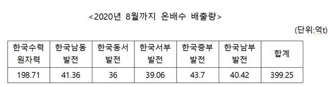 전력 사용량이 늘어나면 온배수 배출량도 늘어난다. 화력발전과 원자력발전 온배수를 비교해보면 한국수력원자력과 5개 발전사의 2020년 1월부터 8월까지 온배수 배출량은 총 399.25억t으로 집계됐다. 평균온도는 취수 전보다 7.2℃ 높았다. 총배출량 가운데 198.71억t이 원전에서, 200.54t이 화력발전소에서 배출됐다. 한울원전이 56.25억t으로 27개 발전소 가운데 가장 많은 배출량을 기록했다.6)