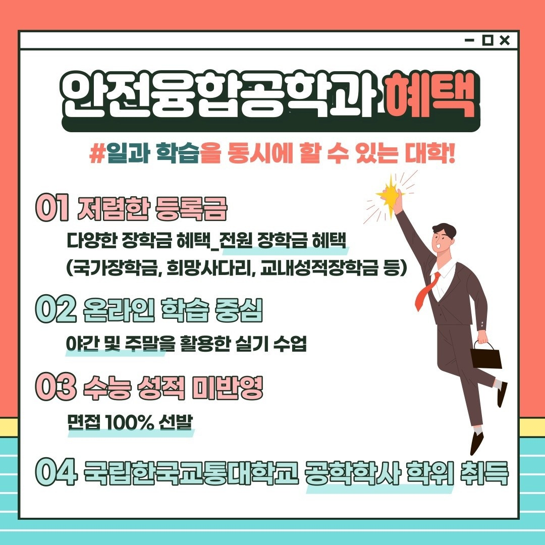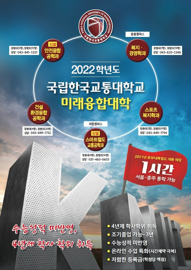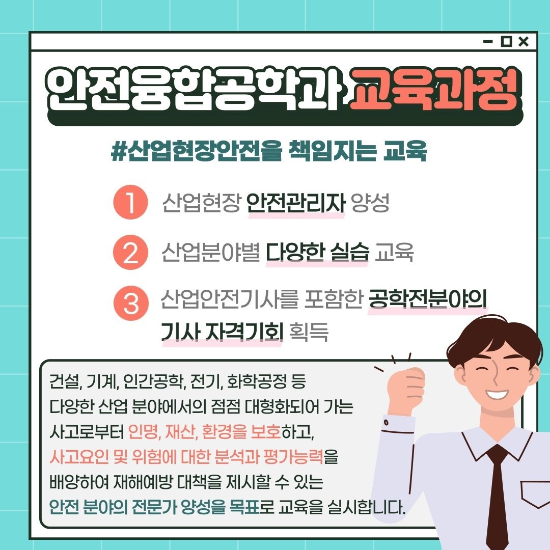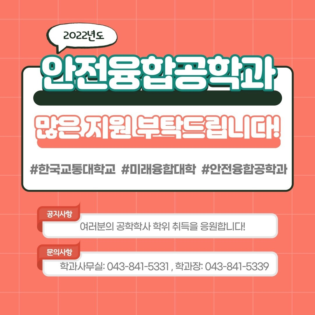 2022 한국교통대학교 미래융합대학교(안전융합공학과) 모집공고 작성자하선영(1,주)|작성시간22.01.30|조회수281 목록 댓글 0 글자크기 작게가 글자크기 크게가 안녕하세요 공정안전연구실입니다. 대한민국의 산업안전을 책임질 미래융합대학(안전융합공학과)에 대해 소개드리려고 합니다. 위 사진의 내용을 참고하여 많은 관심과 추천 부탁드리겠습니다. 감사합니다! 다음검색 현재 게시글 추가 기능 열기 북마크 공유하기 신고 센터로 신고 댓글 댓글 0 댓글쓰기 답글쓰기 댓글 리스트