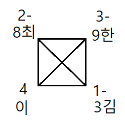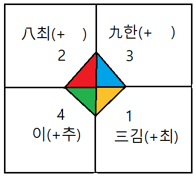 b- 넷-넷(둘) 구성하되, 지난 2-3년 동안 과정에서 배출된 명단 및 내용을 (~에게 ) 받아서, 자기편 넷을 모아, 한명 남기고, 상대편에 3명 나누어 줍니다.