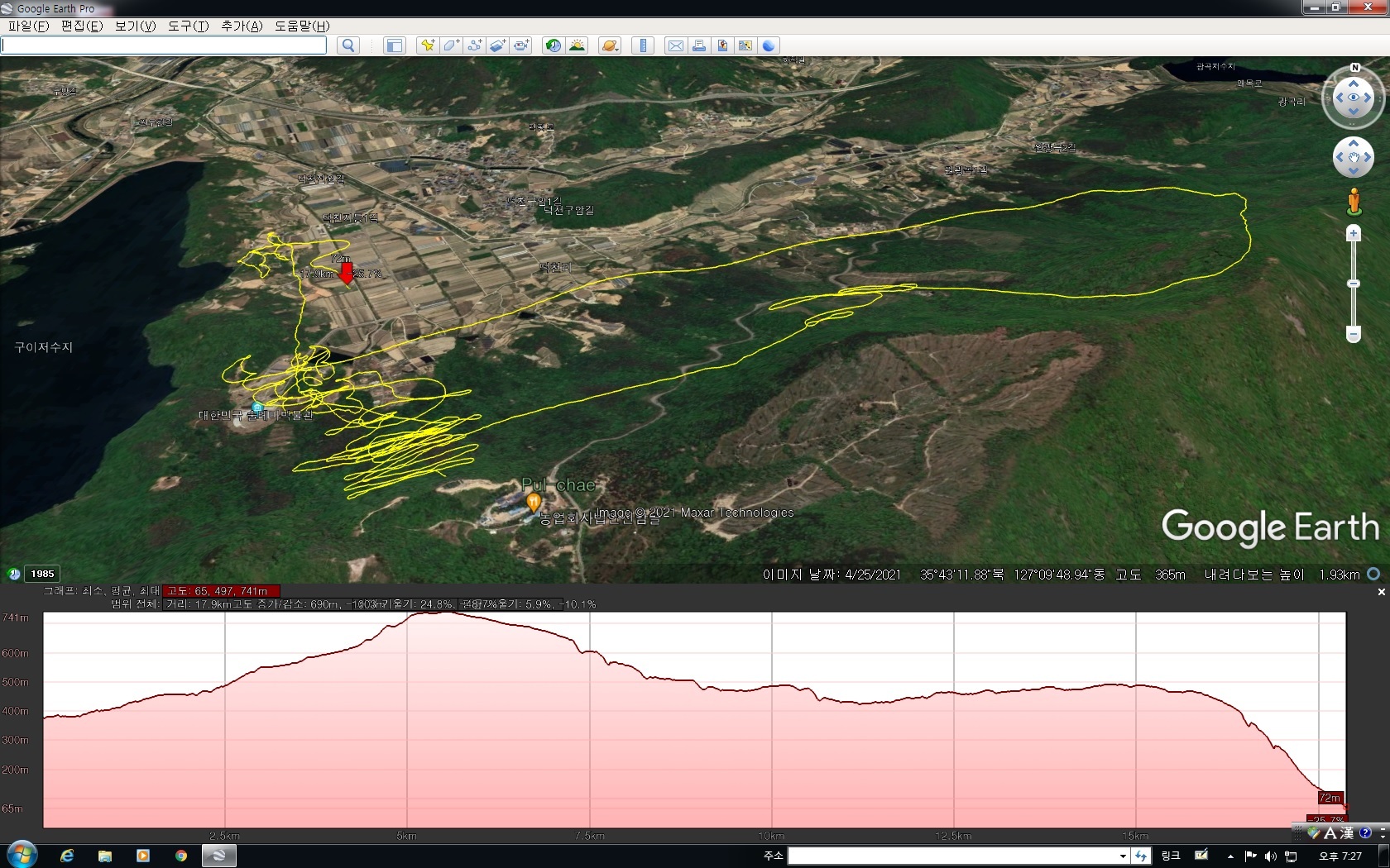 8.이륙고도 : 380m (최고 Flightlog 738m / dump=구글어스 741m) 착륙 70m