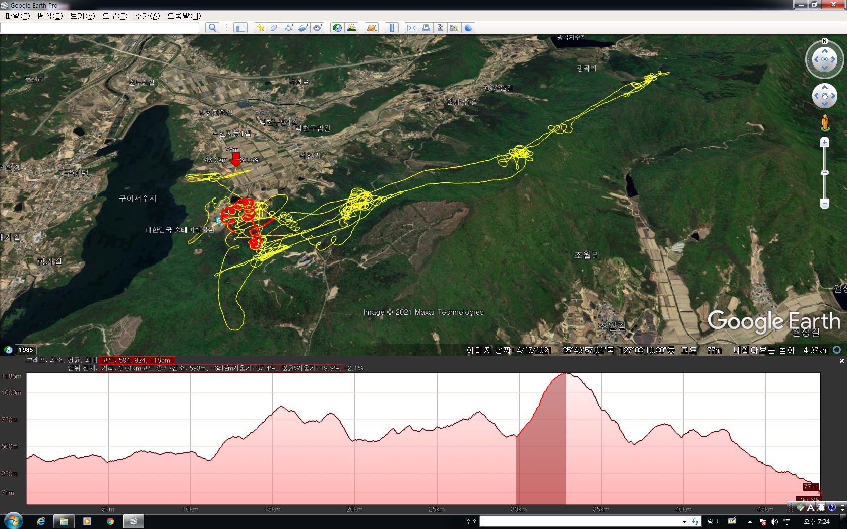 8.이륙고도 : 380m (최고 Flightlog 1,182m / dump=구글어스 1,185m) 착륙 70m