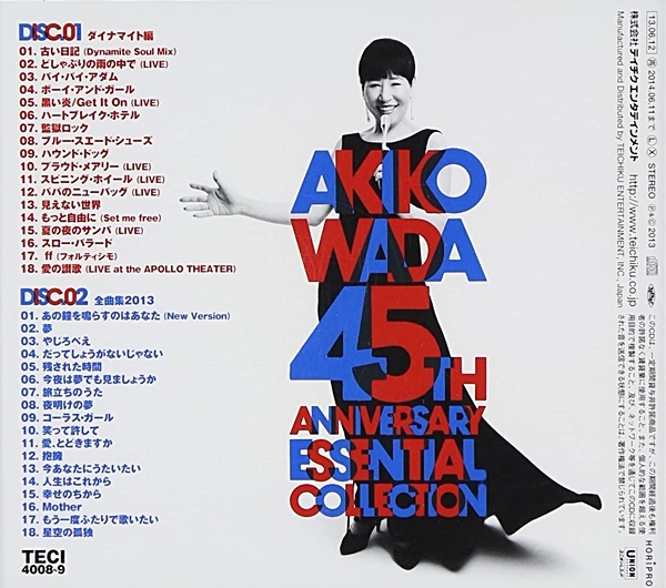 和田アキ子 45th Anniversary Essential Collection Album36曲 (mp3신청하세요) 작성자밀파수|작성시간21.01.08|조회수41 목록 댓글 0 글자크기 작게가 글자크기 크게가 CD (2013年06月12日) 01_あの鐘を鳴らすのはあなた (New Version)-和田アキ子 Disc101. 古い日記 (Dynamite Soul Mix) 04:22 作詞:安井かずみ 作曲:馬飼野康二 編曲:馬飼野康二02. どしゃぶりの雨の中で (LIVE) 01:51 作詞:大日方俊子 作曲:小田島一彦 編曲:山木幸三郎03. バイ・バイ・アダム 03:08 作詞:阿久悠 作曲:村井邦彦 編曲:村井邦彦04. ボーイ・アンド・ガール 02:30 作詞:大日方俊子 作曲:小沢良知 編曲:川口真05. 黒い炎/Get It On (LIVE) 02:55 作詞:B.Chase 作詞:T.Richards 作曲:B.Chase作曲:T.Richards 編曲:森田公一06. ハートブレイク・ホテル 02:23 作詞:M.B.Axton 作詞:T.Durden 作詞:E.Presley作曲:M.B.Axton 作曲:T.Durden 作曲:E.Presley07. 監獄ロック 02:53 作詞:J.Leiber 作詞:M.Stoller 作曲:J.Leiber 作曲:M.Stoller08. ブルー・スエード・シューズ 02:39 作詞:カール・パーキンス 作曲:カール・パーキンス09. ハウンド・ドッグ 02:31 作詞:J.Leiber 作詞:M.Stoller 作曲:J.Leiber 作曲:M.Stoller10. プラウド・メアリー (LIVE) 01:37 作詞:J.Fogerty 作曲:J.Fogerty 編曲:馬飼野康二11. スピニング・ホイール (LIVE) 03:27 作詞:D.C.Thomas 作曲:D.C.Thomas 編曲:馬飼野康二12. パパのニューバッグ (LIVE) 02:28 作詞:ジェームス・ブラウン 作曲:ジェームス・ブラウン13. 見えない世界 03:25 作詞:及川恒平 作曲:細野晴臣 編曲:東海林修14. もっと自由に(Set me free) 02:47 作詞:阿木燿子 作曲:宇崎竜童 編曲:馬飼野俊一15. 夏の夜のサンバ (LIVE) 02:09 作詞:阿久悠 作曲:森田公一 編曲:森田公一16. スロー・バラード 04:36 作詞:忌野清志郎 作曲:忌野清志郎 編曲:林有三17. ff(フォルティシモ) 03:54 作詞:松尾由紀夫 作曲:蓑輪単志 編曲:白井良明18. 愛の讃歌 (LIVE at the APOLLO THEATER) 04:11 作詞:Margueritte Angele Monnot 作詞:エディット・ピアフ 訳詩:岩谷時子作曲:Margueritte Angele Monnot 作曲:エディット・ピアフ 編曲:山口英次Disc201. あの鐘を鳴らすのはあなた (New Version) 03:50 作詞:阿久悠 作曲:森田公一 編曲:大谷和夫02. 夢 04:36 作詞:石井竜也 作曲:石井竜也 編曲:勝又隆一03. やじろべえ 04:50 作詞:秋元康 作曲:都志見隆 編曲:椎名和夫04. だってしょうがないじゃない 04:17 作詞:川村真澄 作曲:馬飼野康二 編曲:矢島賢05. 残された時間 05:21 作詞:秋元康 作曲:羽場仁志 編曲:安部潤06. 今夜は夢でも見ましょうか 04:02 作詞:松井五郎 作曲:羽場仁志 編曲:林有三07. 旅立ちのうた 04:38 作詞:BANANA ICE 作曲:BANANA ICE 編曲:沢田完08. 夜明けの夢 02:44 作詞:阿久悠 作曲:都倉俊一 編曲:都倉俊一09. コーラス・ガール 03:20 作詞:竜真知子 作曲:川口真 編曲:馬飼野康二10. 笑って許して 02:39 作詞:阿久悠 作曲:羽根田武邦 編曲:馬飼野俊一11. 愛、とどきますか 04:42 作詞:なかにし礼 作曲:林哲司 編曲:林哲司12. 抱擁 03:49 作詞:阿久悠 作曲:都志見隆 編曲:小笠原寛13. 今あなたにうたいたい 04:21 作詞:加藤登紀子 作曲:加藤登紀子 編曲:馬飼野康二14. 人生はこれから 04:34 作詞:松井五郎 作曲:チャイコフスキー 作曲:羽場仁志 編曲:安部潤15. 幸せのちから 04:58 作詞:M.Y 作曲:M.Y 編曲:M.Y16. Mother 04:31 作詞:秋元康 作曲:鈴木キサブロー 編曲:林有三17. もう一度ふたりで歌いたい 04:53 作詞:阿久悠 作曲:森田公一 編曲:水谷公生18. 星空の孤独 03:22 作詞:阿久悠 作曲:ロビー和田 編曲:村井邦彦 다음검색 현재 게시글 추가 기능 열기 북마크 공유하기 신고 센터로 신고 댓글 댓글 0 댓글쓰기 답글쓰기 댓글 리스트