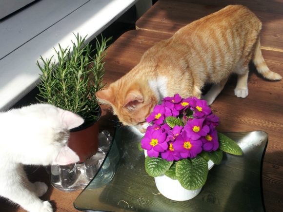 꽃 화분에 코를 박고 냄새를 맡기도 하고