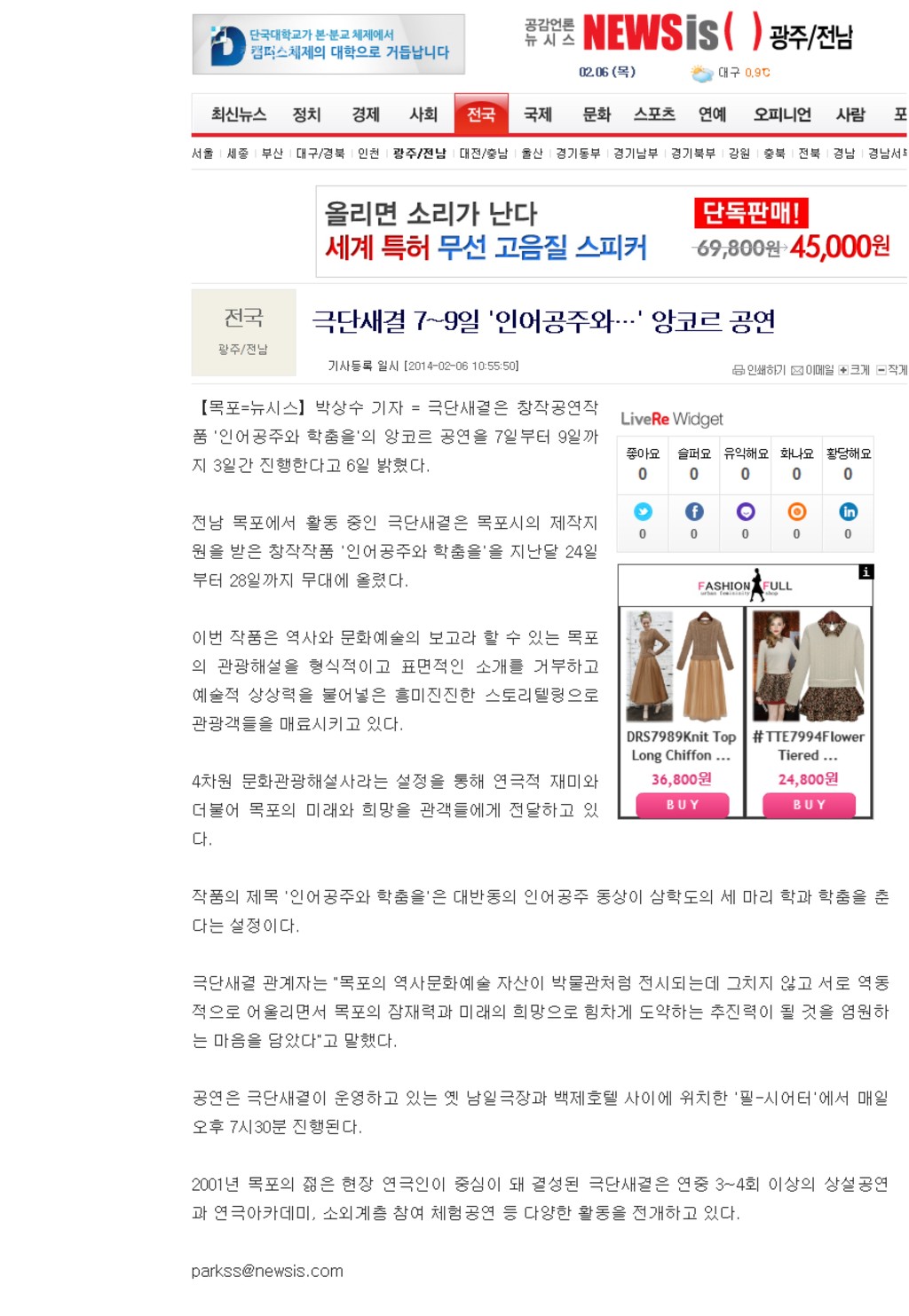 2014.2.6 뉴시스 _ 인어공주와 학춤을!! 극단 새결 작성자극단새결|작성시간14.02.06|조회수89 목록 댓글 0 글자크기 작게가 글자크기 크게가 http://www.newsis.com/ar_detail/view.html?ar_id=NISX20140206_0012703436&cID=10809&pID=10800 다음검색 현재 게시글 추가 기능 열기 북마크 공유하기 신고 센터로 신고 댓글 댓글 0 댓글쓰기 답글쓰기 댓글 리스트