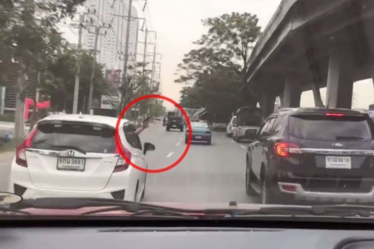 상태에서 차량 창문을 통해 총기를 꺼내 들고 하늘에 2방, 길을 내주지 않은 차량에