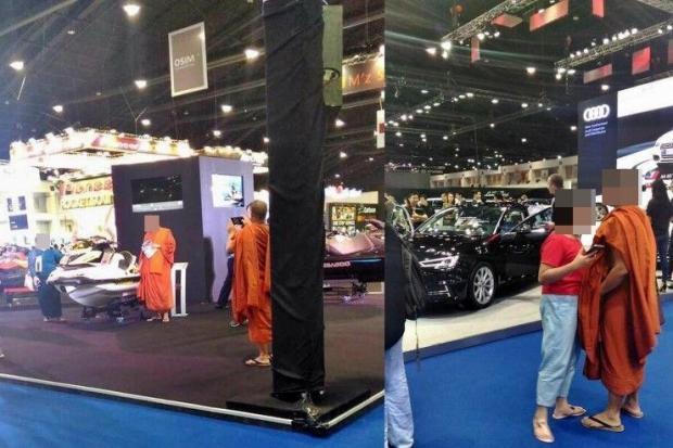 온라인 상으로 제38회 방콕 인터내셔날 모터쇼의 행사장에서 승려들이 차량을 둘러보고