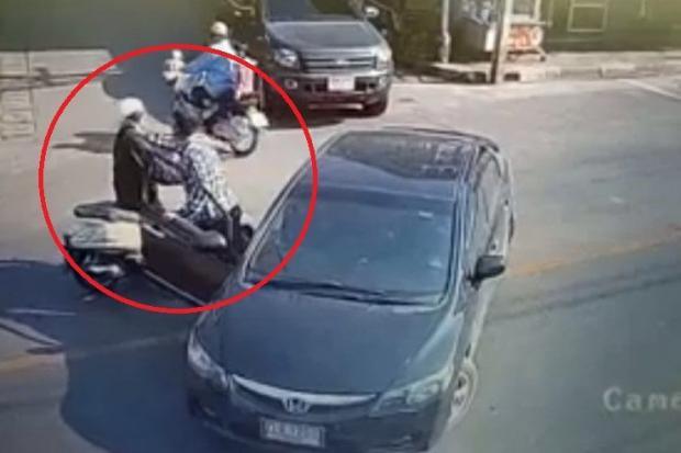 길을 막아 버린 1꺼머 7539 우따라딧도 번호판의 야마하 피노 오토바이를