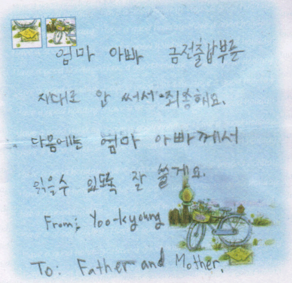 짧지만 아빠,엄마를 너무 행복하게 만드는 편지를 유경이가 엄마 지갑에다 꽂아 두었습니다..