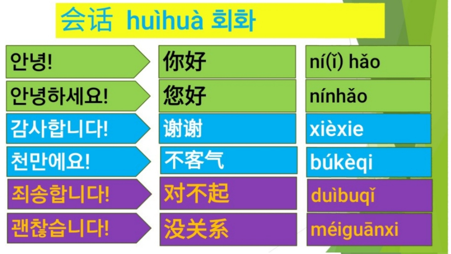 증국어 특강(3) 작성자비가.|작성시간19.03.28|조회수46 목록 댓글 0 글자크기 작게가 글자크기 크게가 니하우 : 안녕닌하우 : 안녕하세요?셰셰 : 감사합니다.부세 : 천만에요.부커치 : 천만에요.두워이부치 : 죄송합니다.메이셔ㄹ : 괜찮습니다.메이꽌시 : 괜찮습니다. 다음검색 현재 게시글 추가 기능 열기 북마크 공유하기 신고 센터로 신고 댓글 댓글 0 댓글쓰기 답글쓰기 댓글 리스트